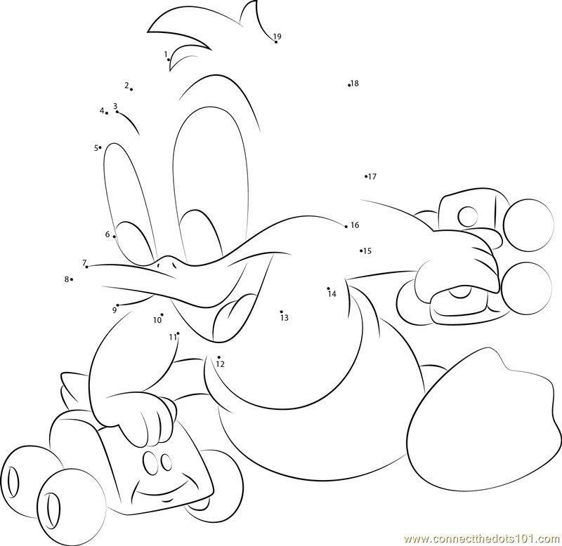 Baby Daffy Duck playing with Cars Connect the Dots worksheet